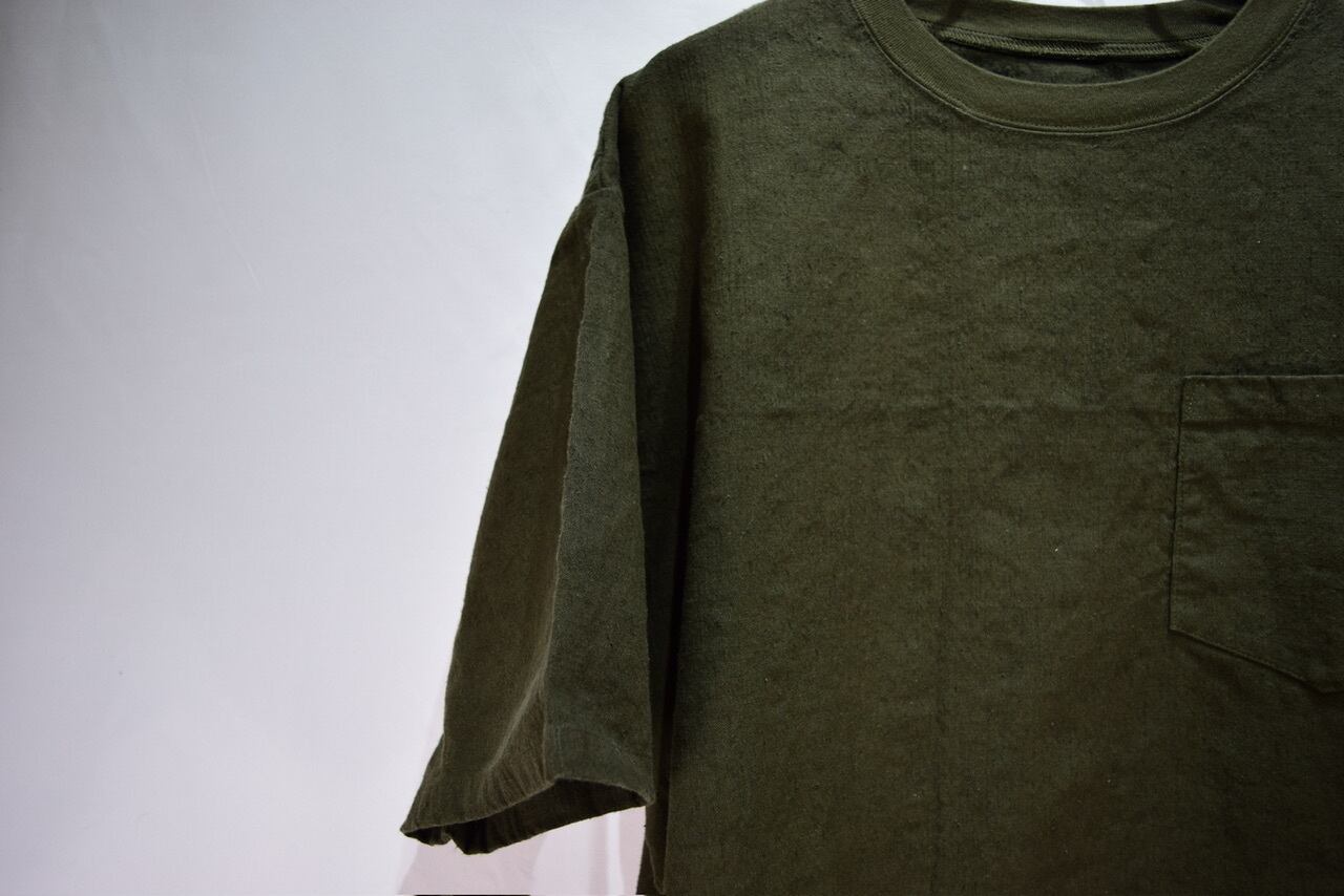 リネン生地の中でも最高級と言われている「フレンチリネン」を使用しオリーブカラー、ブラウンカラーの2色展開、ワンサイズでTシャツを製作しました。