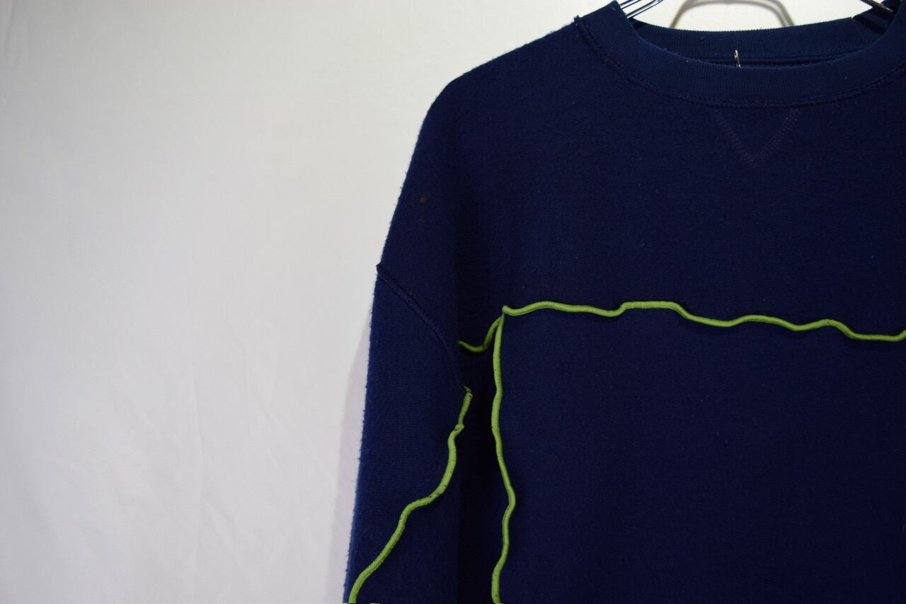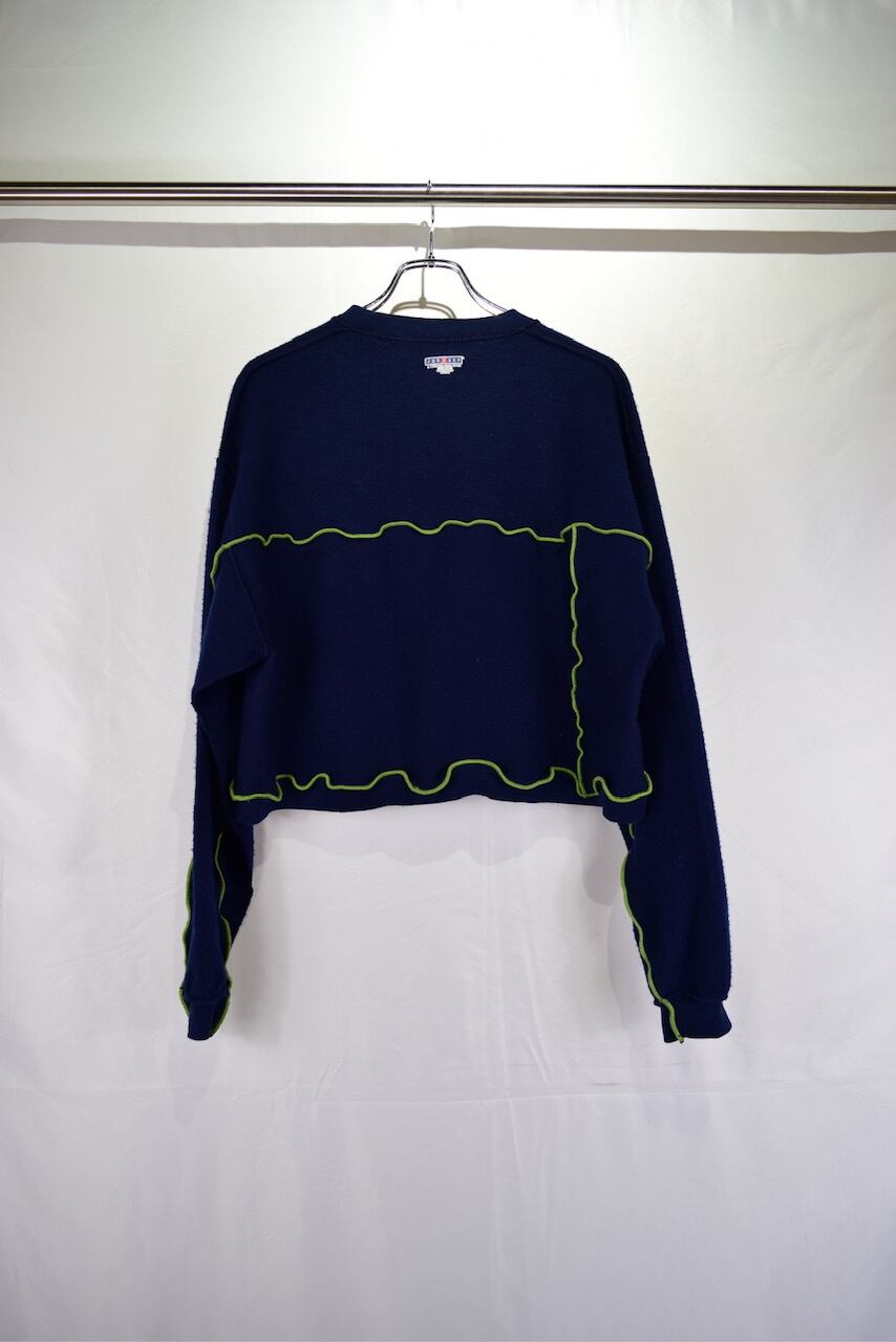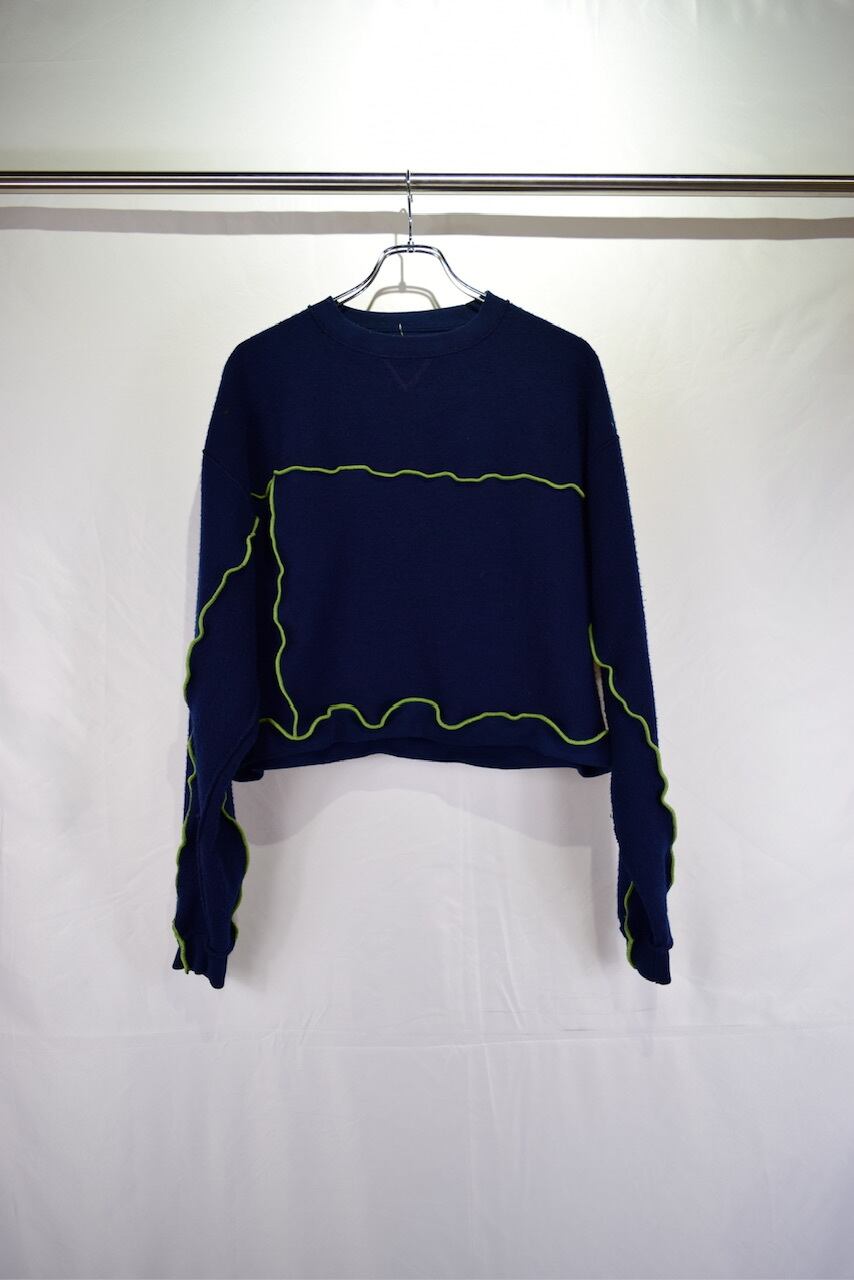 元のサイズが少し大きめな無地スウェットを裏返してメロウステッチ(ゆるく波打つ様に縫い上げるデザイン)を施し、ショート丈にカットして作り上げたリメイクアイテムです。