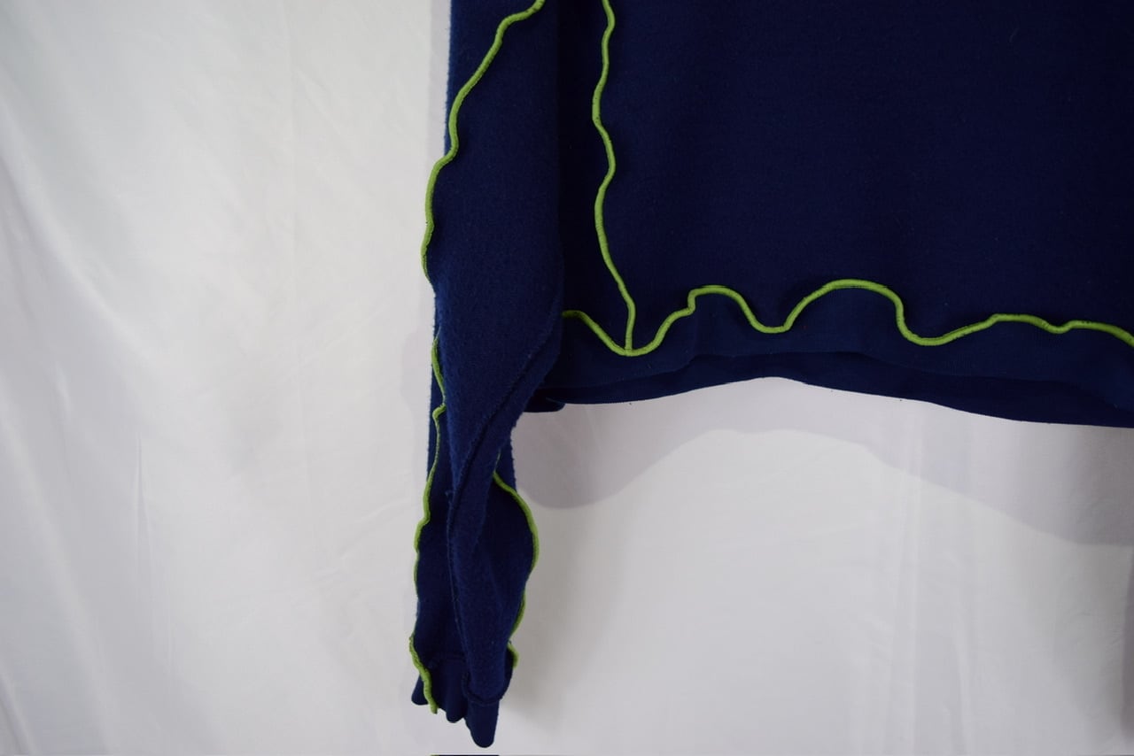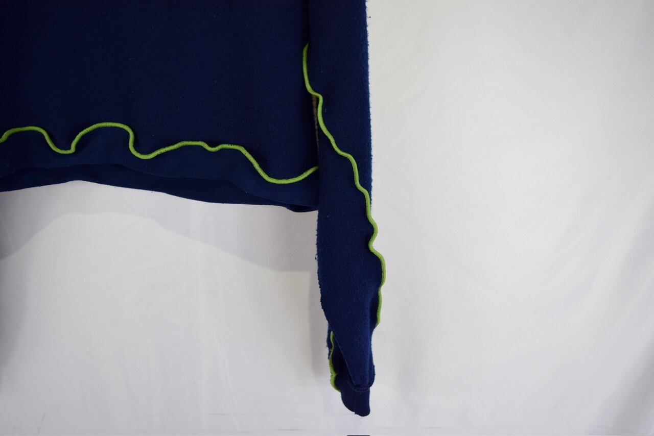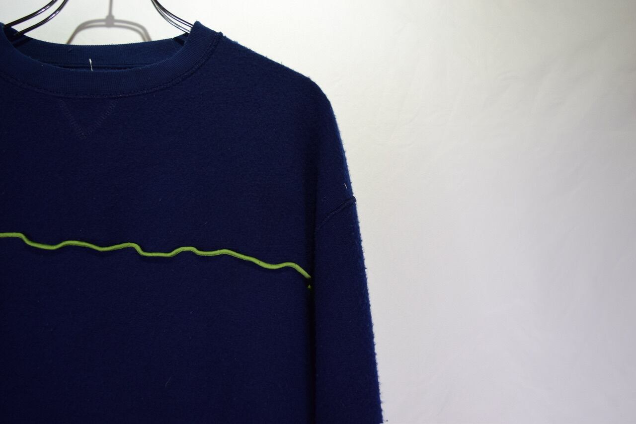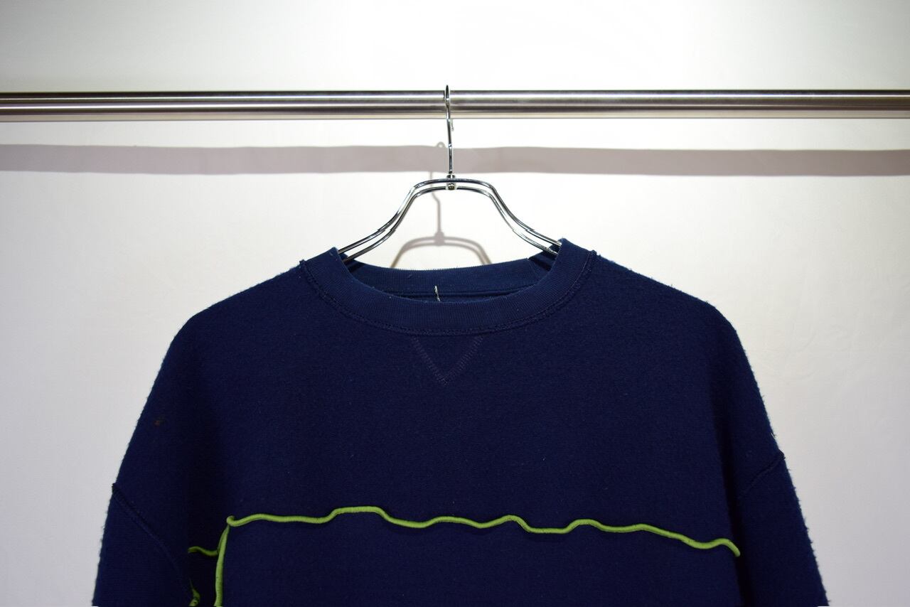 元のサイズが少し大きめな無地スウェットを裏返してメロウステッチ(ゆるく波打つ様に縫い上げるデザイン)を施し、ショート丈にカットして作り上げたリメイクアイテムです。
