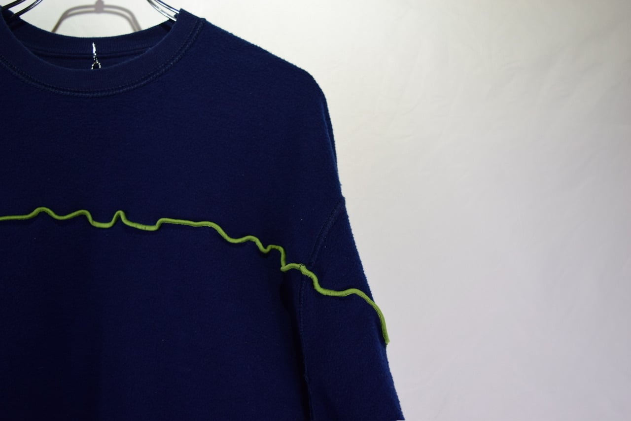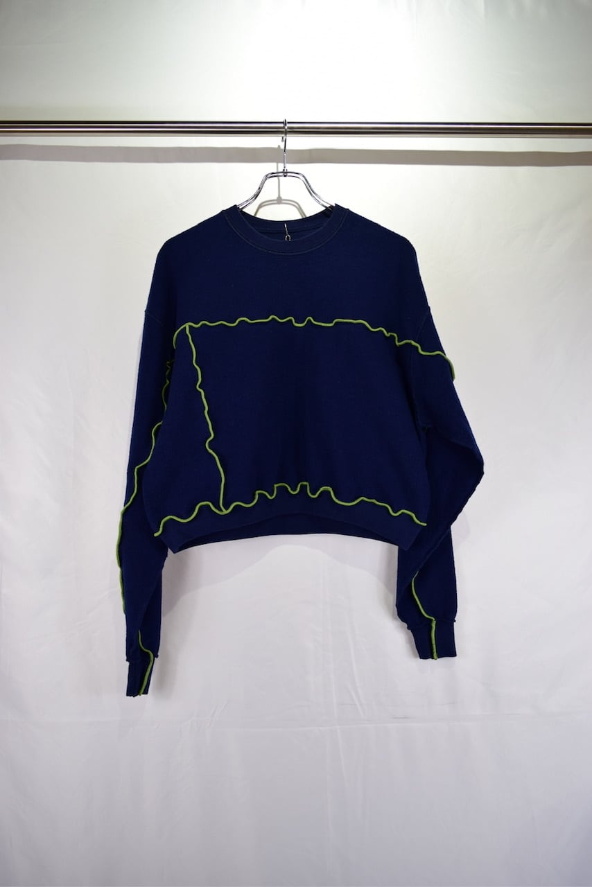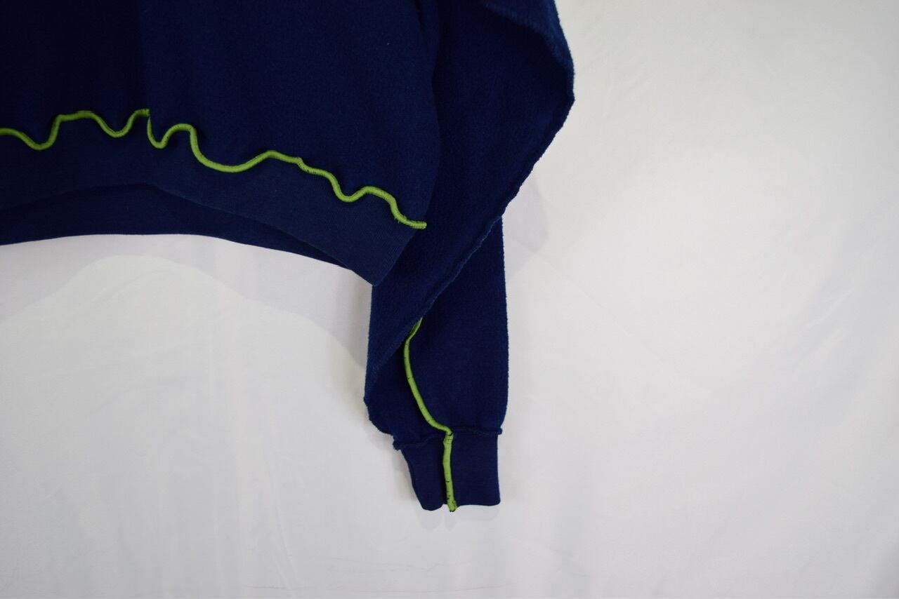 元のサイズが少し大きめな無地スウェットを裏返してメロウステッチ(ゆるく波打つ様に縫い上げるデザイン)を施し、ショート丈にカットして作り上げたリメイクアイテムです。