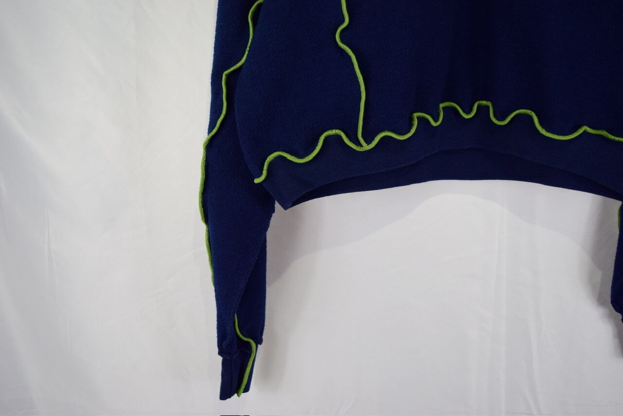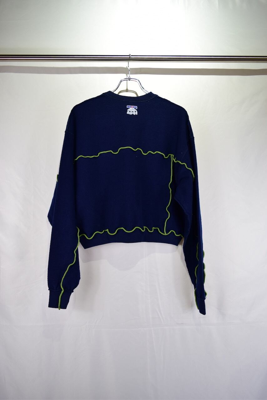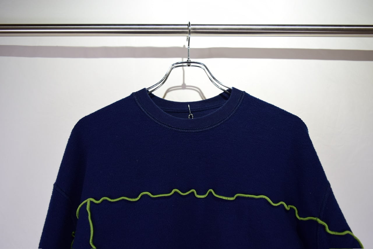 元のサイズが少し大きめな無地スウェットを裏返してメロウステッチ(ゆるく波打つ様に縫い上げるデザイン)を施し、ショート丈にカットして作り上げたリメイクアイテムです。