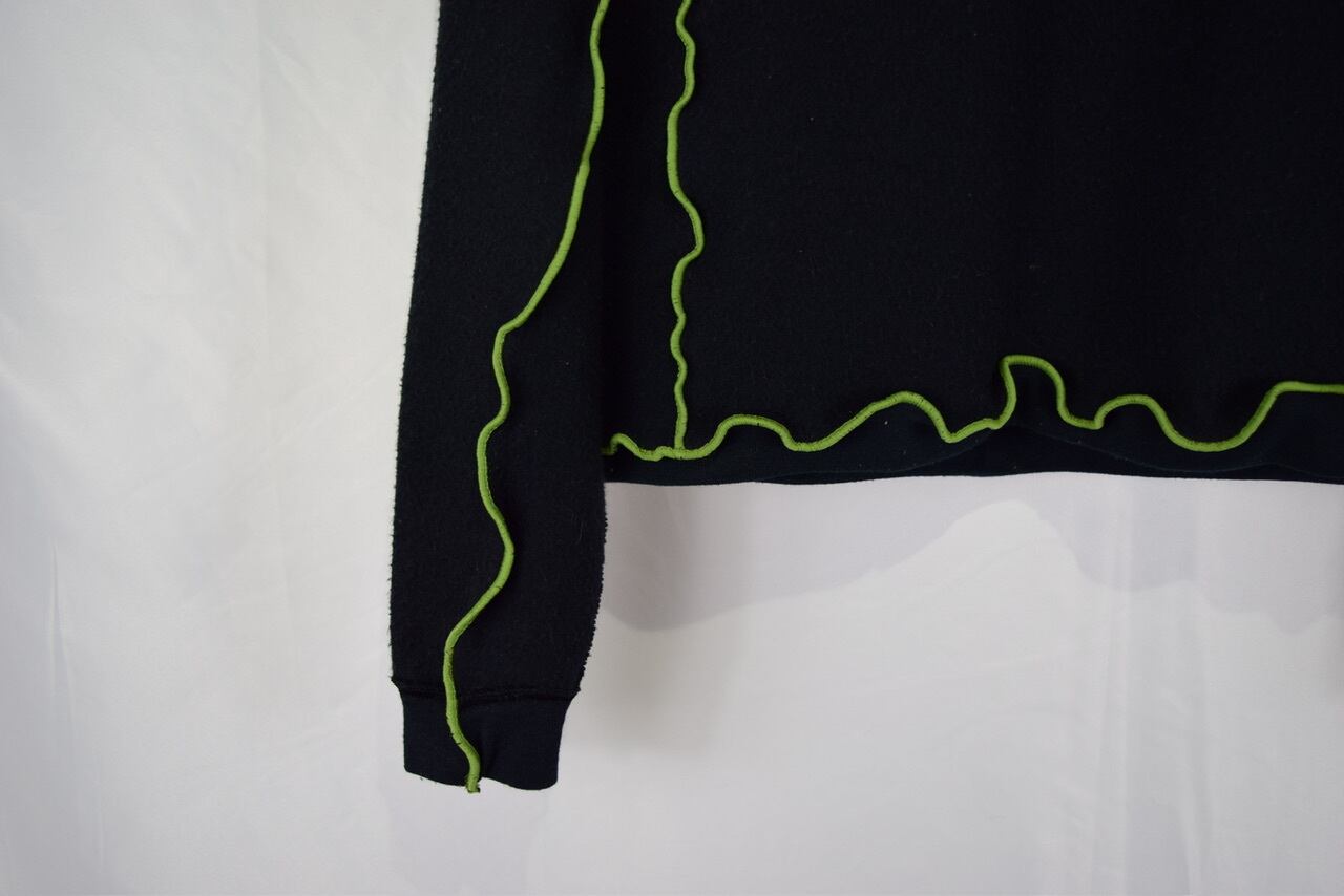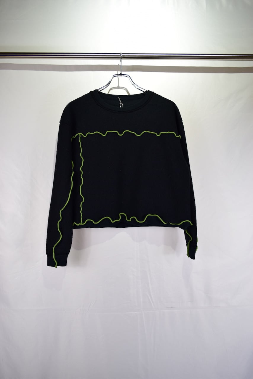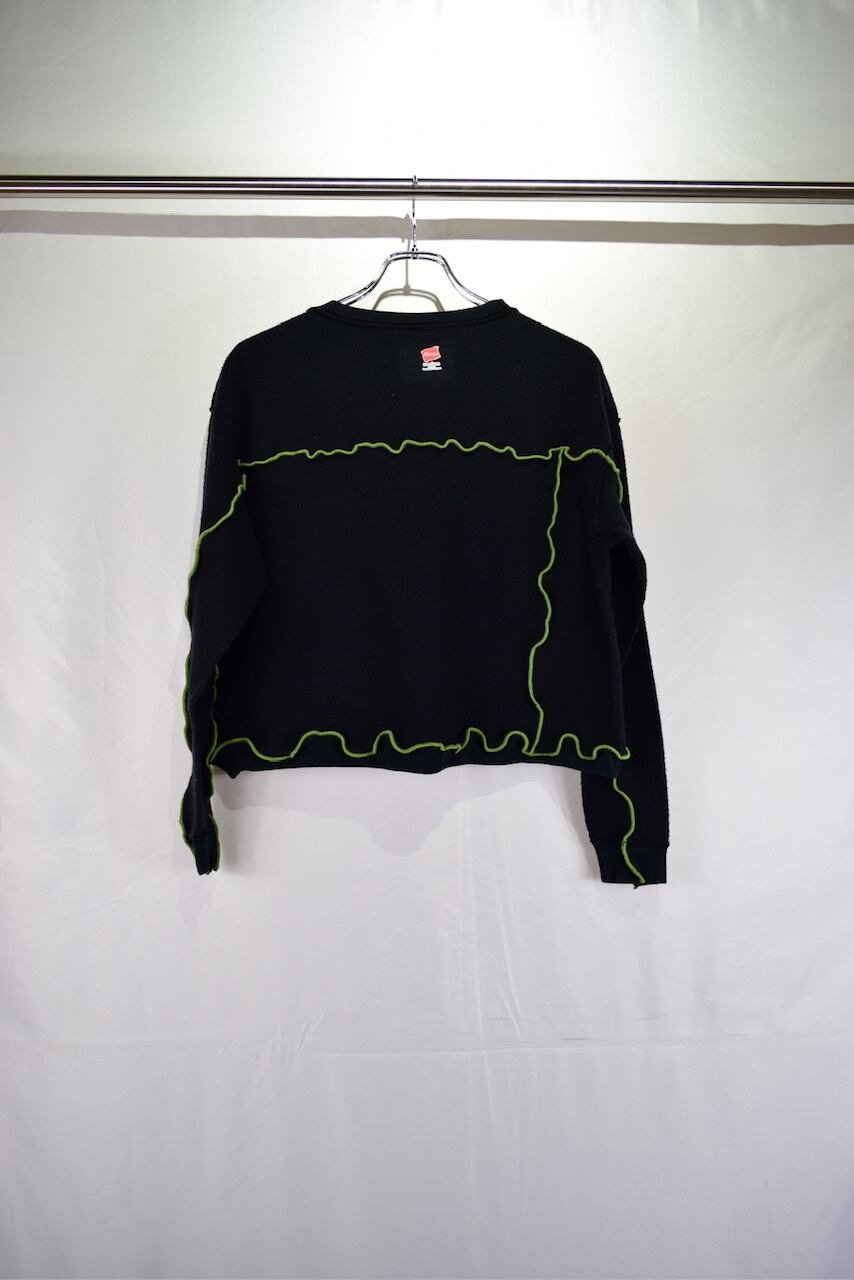 元のサイズが少し大きめな無地スウェットを裏返してメロウステッチ(ゆるく波打つ様に縫い上げるデザイン)を施し、ショート丈にカットして作り上げたリメイクアイテムです。