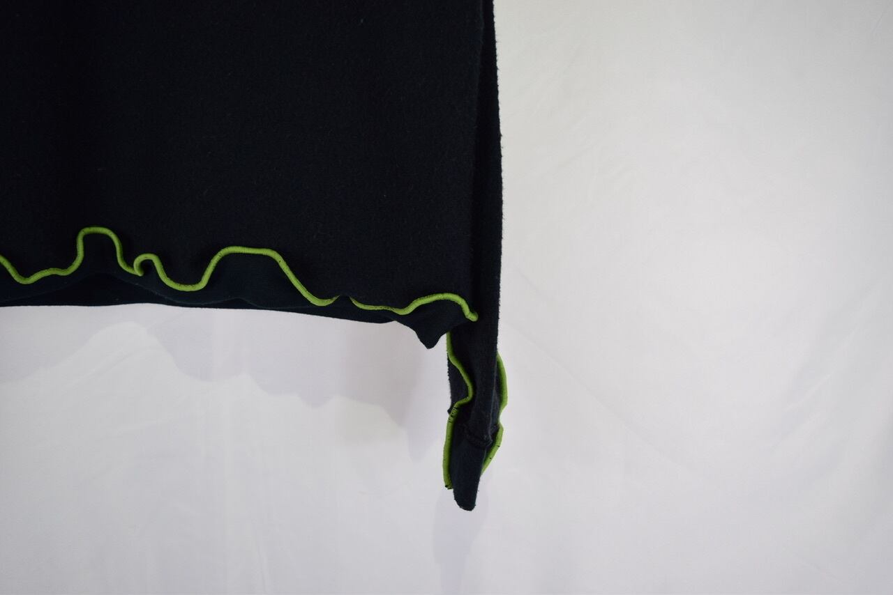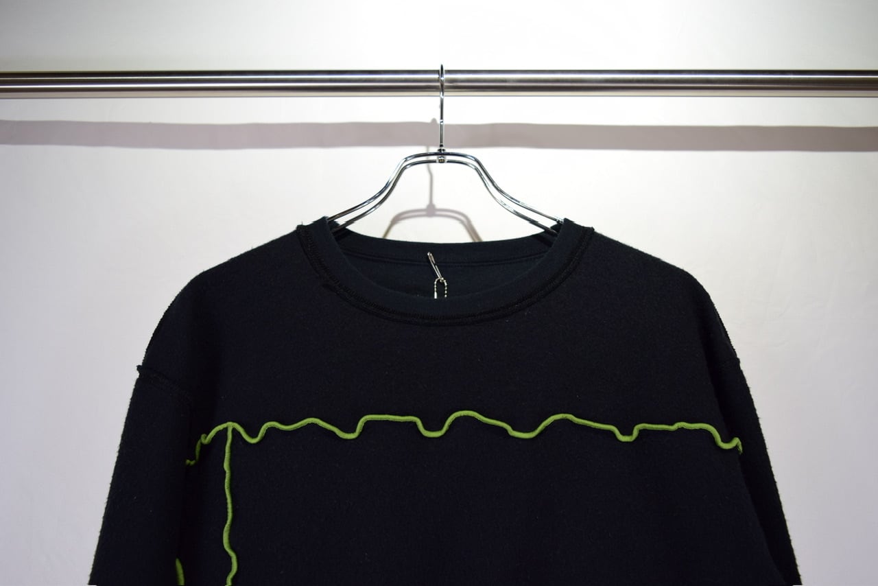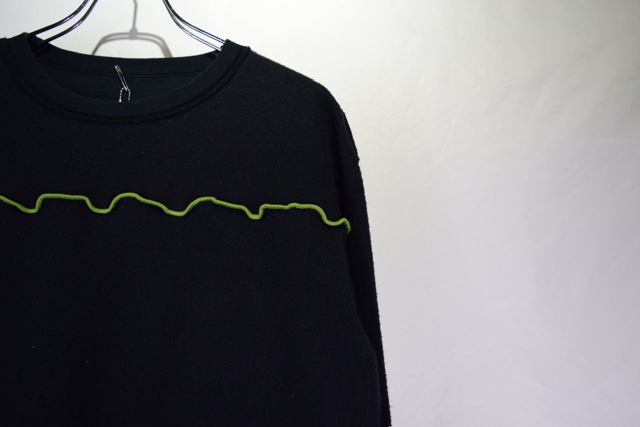 元のサイズが少し大きめな無地スウェットを裏返してメロウステッチ(ゆるく波打つ様に縫い上げるデザイン)を施し、ショート丈にカットして作り上げたリメイクアイテムです。