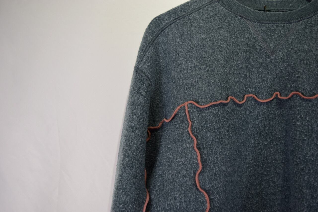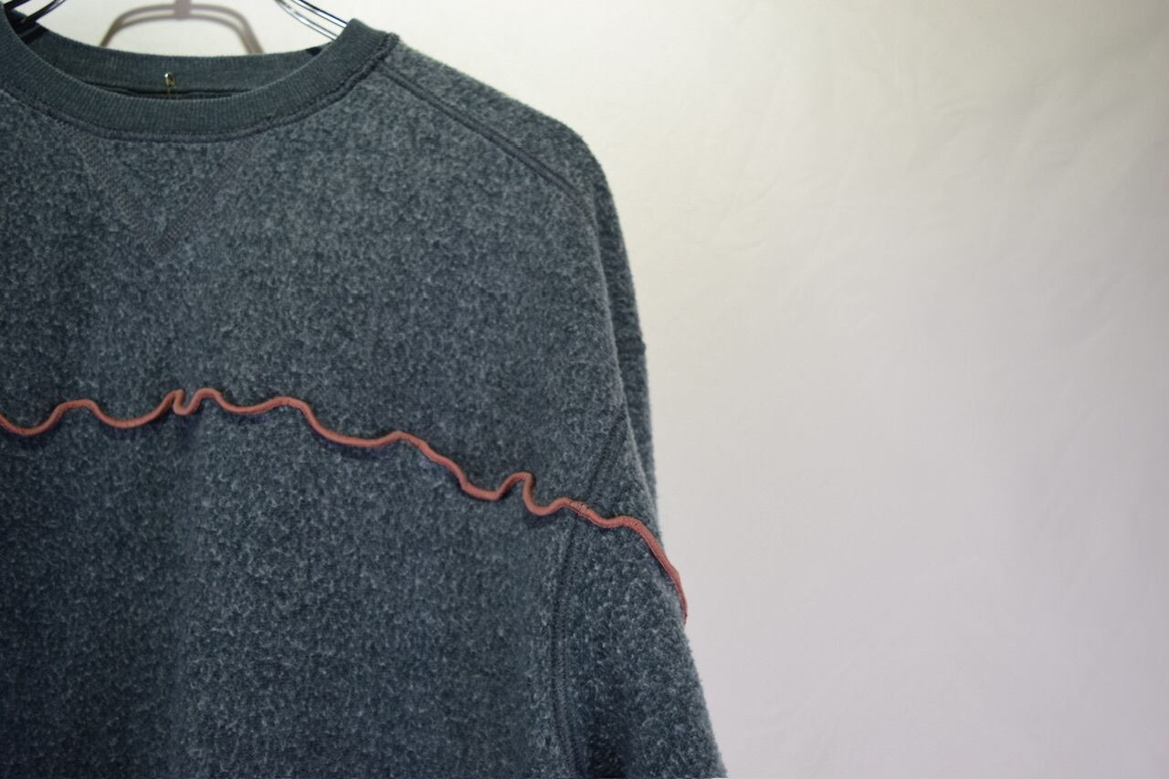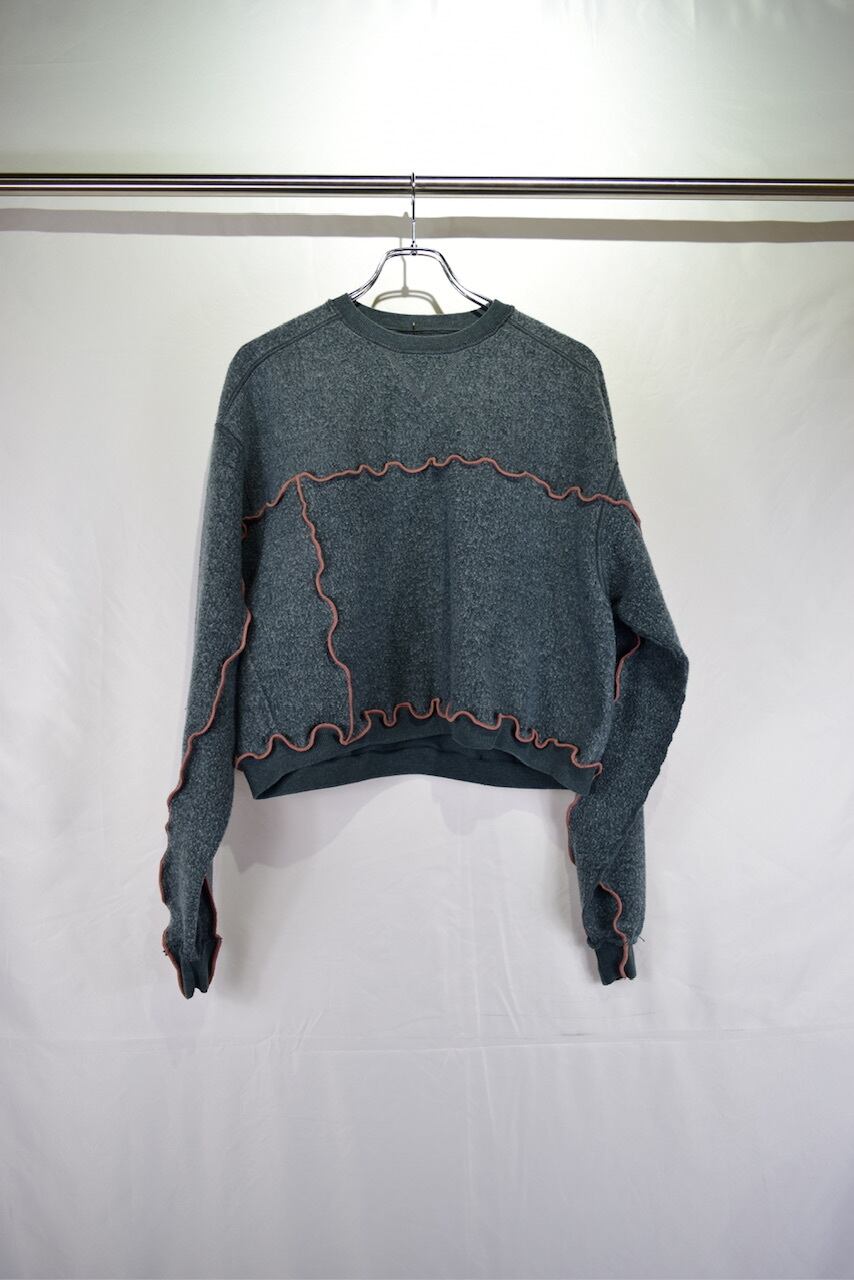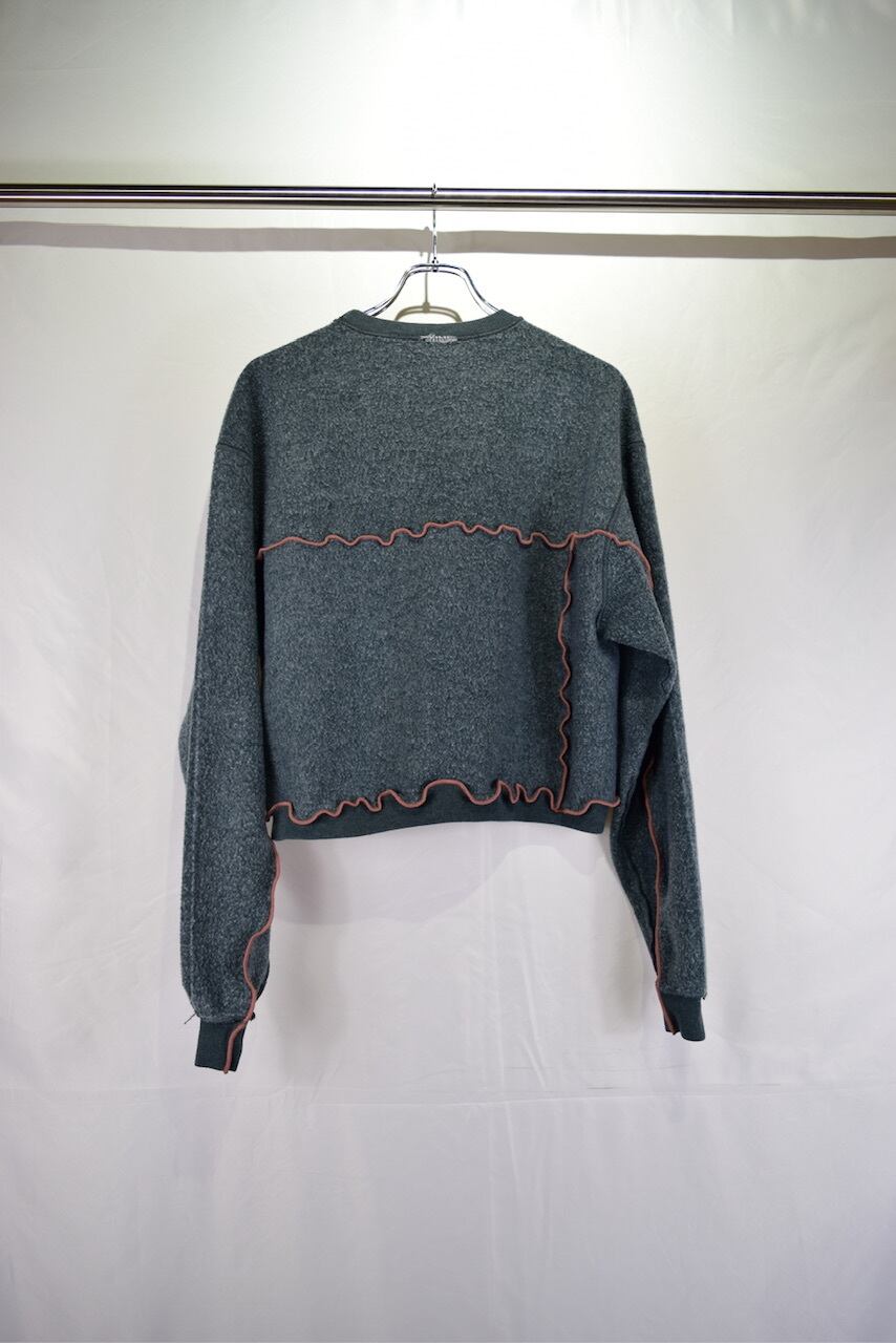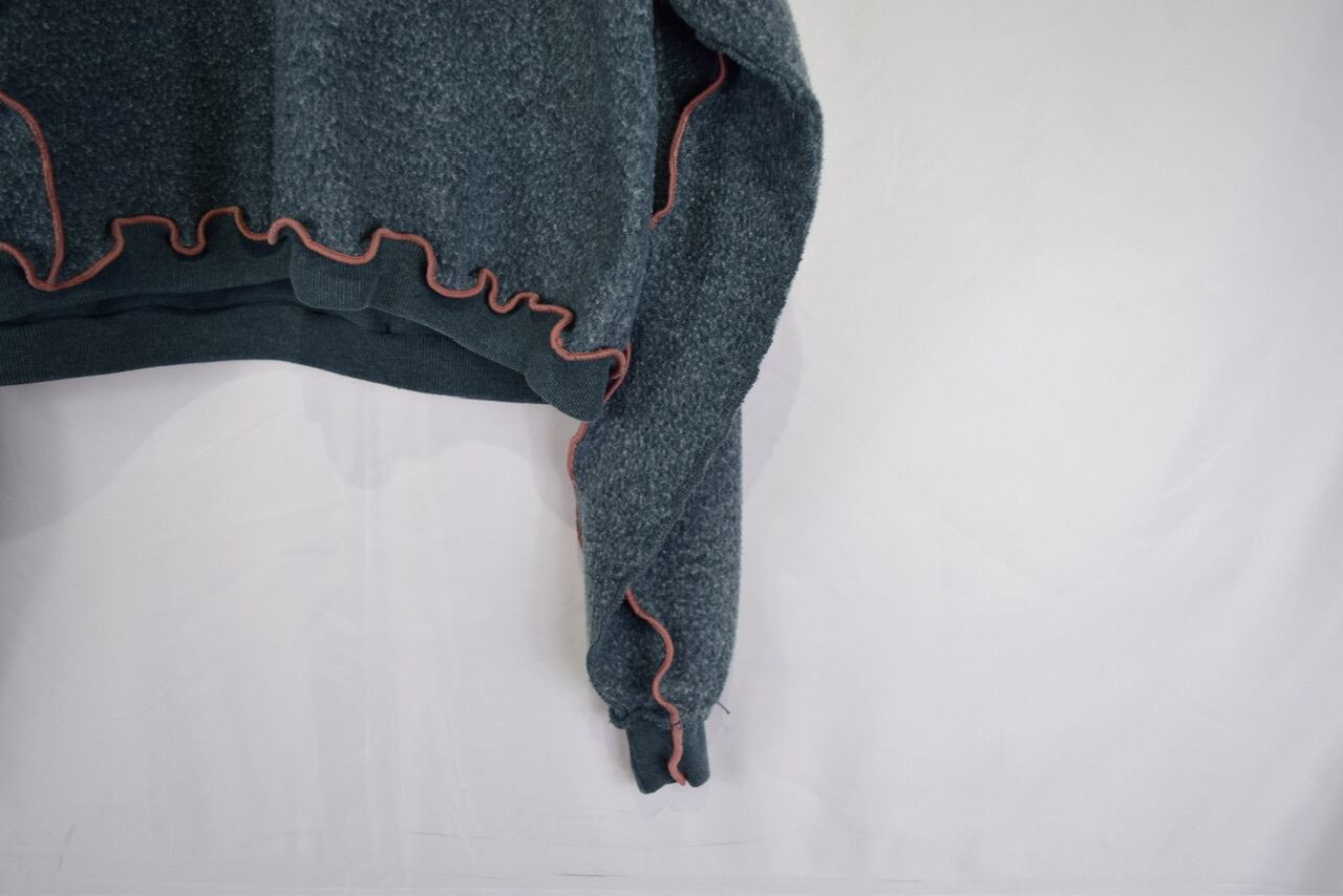 元のサイズが少し大きめな無地スウェットを裏返してメロウステッチ(ゆるく波打つ様に縫い上げるデザイン)を施し、ショート丈にカットして作り上げたリメイクアイテムです。