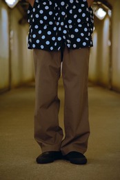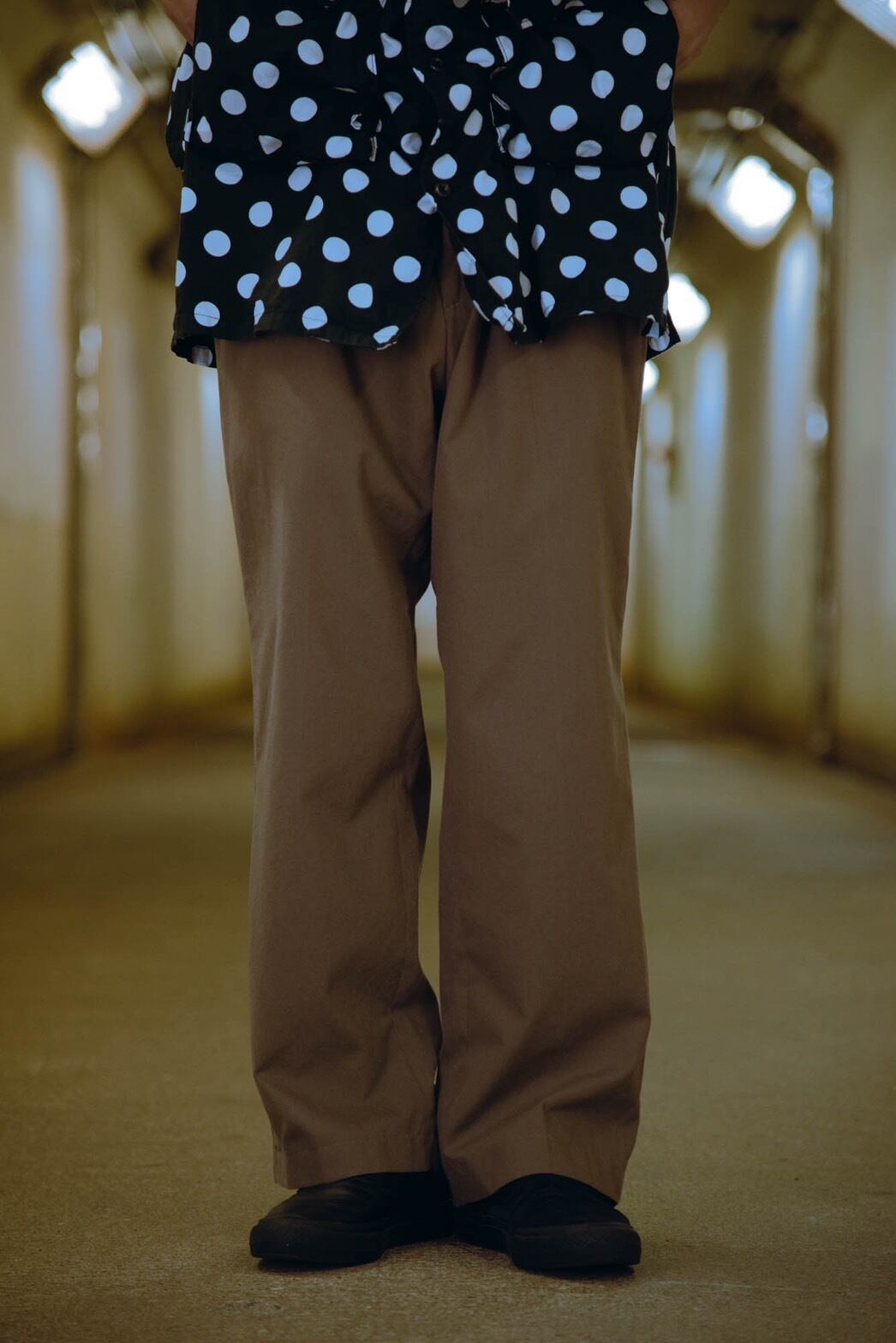 あえてポリエステル生地のフレアパンツを選び、カラーもベージュ、ブラウン、オリーブ、ネイビー、ブラックと豊富にございます。
