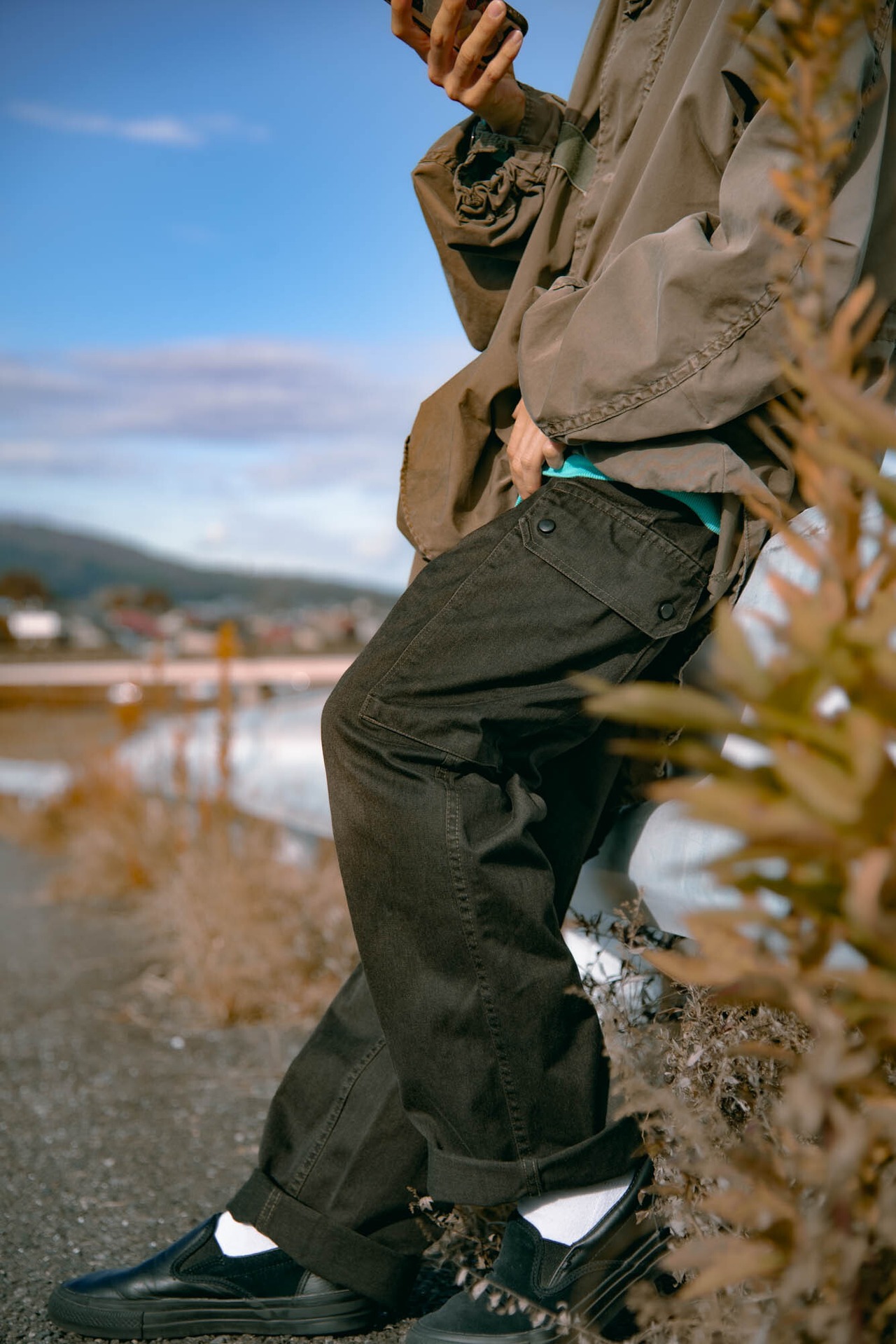 今回は西ドイツ軍のリフレクターカモカーゴパンツをブラック染めとダークグリーン染めにし、裾上げ(L30〜L27)に整えて作りました◎