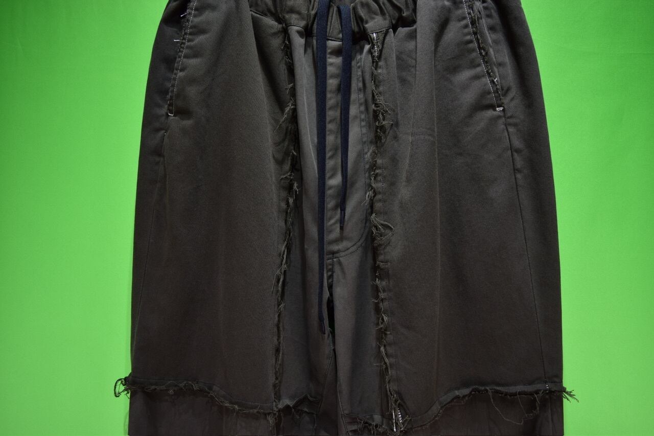 生地と生地をつなぎ合わせ、フリンジ加工、ウエストゴム加工を加えて進化したリメイクパンツです◎